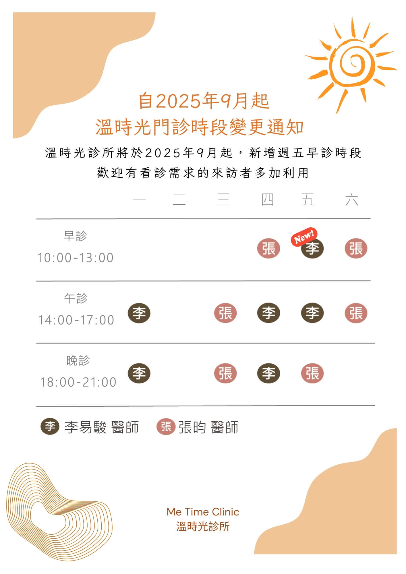 李易駿醫師將於2025年9月起,新增週五上午門診時段,為大家提供更便利的醫療服務,歡迎有需求的來訪者多加利用。
