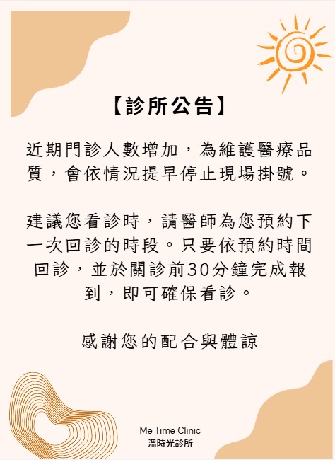 近期門診的人數增加,為了維護醫療品質與每位病患的看診時間,本診所會依現場情況,提早停止現場掛號。
