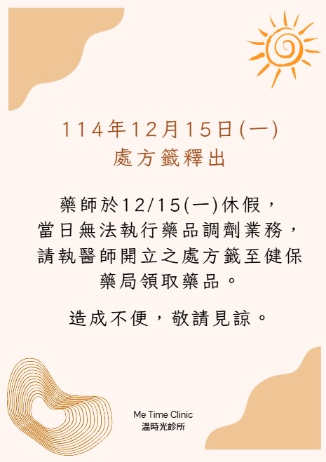 溫時光診所將於2025年12月15號(一)處方籤釋出乙次。