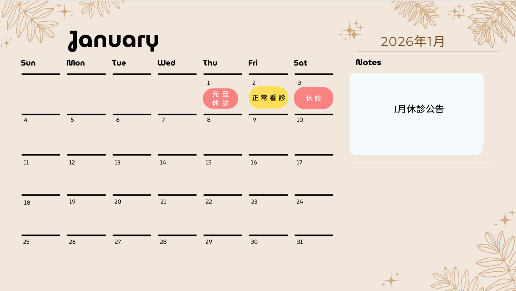 溫時光診所將於: 2026年01月01號(四) 元旦休診乙次。 2026年01月02號(五) 正常看診。 2026年01月03號(六) 休診乙次。 請有看診或回診需求的來訪者,提前安排就診時間。 休診當日如急需用藥,建議就近至醫院急診開立藥品, 造成不便敬請見諒!