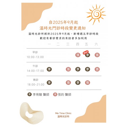 自2025年7月起,溫時光門診與醫師看診時段變更通知 溫時光診所將於2025年7月起,變更門診與醫師看診時段。請有看診或回診需求的來訪者,提前安排就診時間, 造成不便敬請見諒!