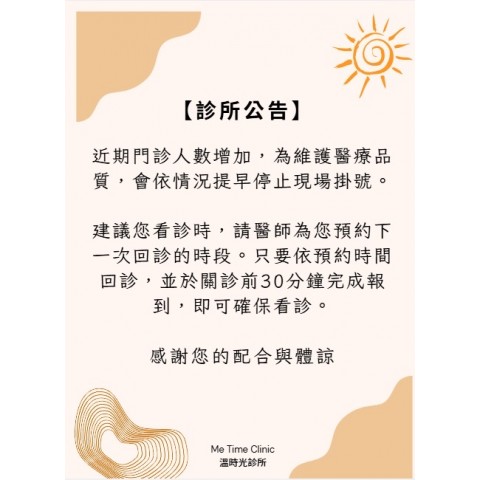溫時光診所 提早停止掛號公告 親愛的來訪者您好: 近期門診的人數增加,為了維護醫療品質與每位病患的看診時間,本診所會依現場情況,提早停止現場掛號。 為了讓您順利回診,建議您在看診時,請醫師為您預約下...