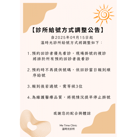 溫時光診所 給號方式調整公告 自2025年09月15日起,溫時光診所給號方式將調整如下: 1.預約回診者優先看診,現場掛號的複診,將排於所有預約回診者後看診 2.預約時不再提供號碼,依回診當日報到順序給號 3.報到...