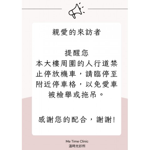 大樓周圍人行道禁止停放機車公告 親愛的來訪者您們好, 由於本大樓的進出入口與人行道皆禁止停放機車,為避免您的愛車被檢舉或拖吊,若有停車需求,診所附近路段有許多機車停車格,歡迎臨停使用。感謝您的配合...