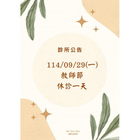 2025年9月29號 (一) 教師節休診通知 溫時光診所將於2025年9月29號(一)教師節休診乙次。 請有看診或回診需求的來訪者,提前安排就診時間。休診時段如急需用藥,建議就近至醫院急診開立藥品, 造成不便敬請見諒! ...